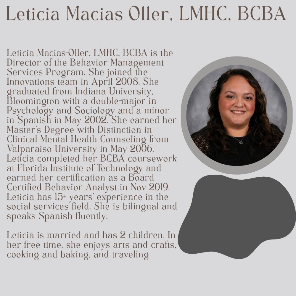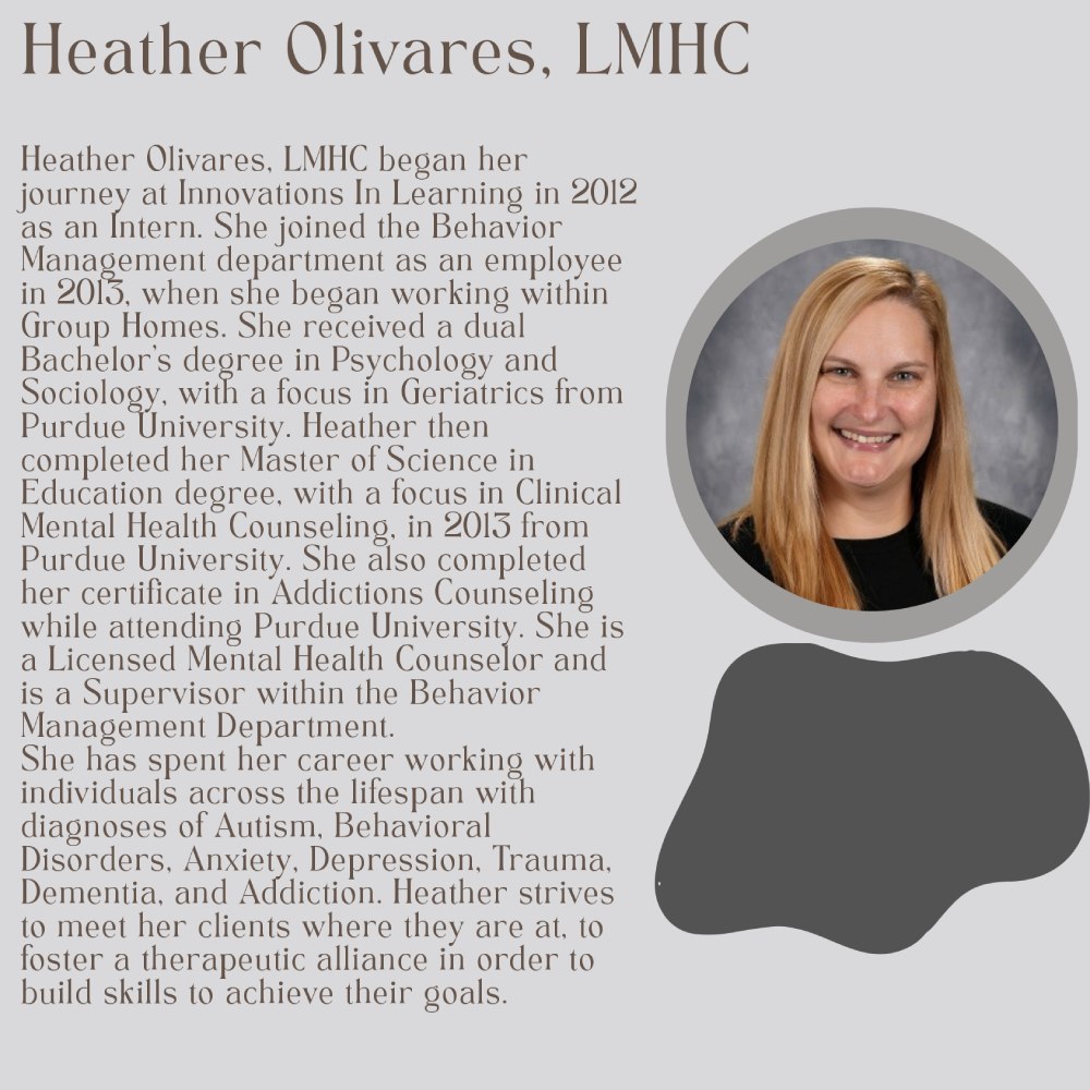 Innovations in Learning’s BMAN department provides behavior services through the Indiana Medicaid Waiver program. These services are based in the individuals home and/or community settings and may include day program visits. BMAN services begin with a comprehensive review of background information and history, and a functional behavior assessment. The clinician develops an individualized Behavior Support Plan that is focused on teaching new skills and reducing problem behaviors. Support and intervention is provided by our skilled clinician in regular sessions typically occurring weekly or bi-weekly, depending on the individual’s needs. Training of caregivers, staff and family members is also a critical part of the program.